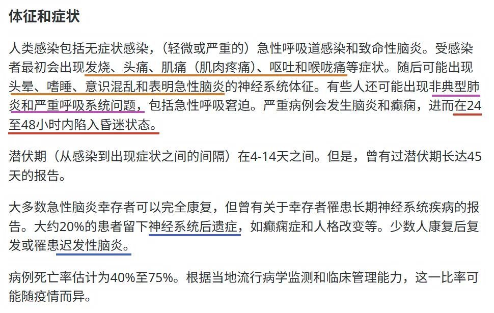世界卫生组织在其“关键事实”中对尼帕病毒的描述非常直接——“可引起一系列临床表现,从无症状感染(亚临床)到急性呼吸道感染和致命性脑炎。”