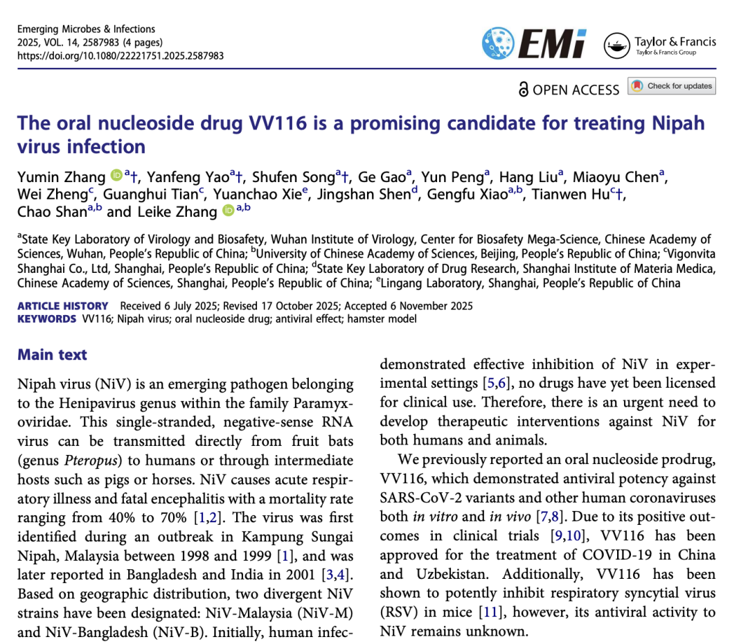最近,中国科学院武汉病毒研究所,联合上海药物研究所、旺山旺水生物医药股份有限公司发表了一项重要研究成果,证实口服核苷类药物VV116对尼帕病毒具有显著的抗病毒活性。
